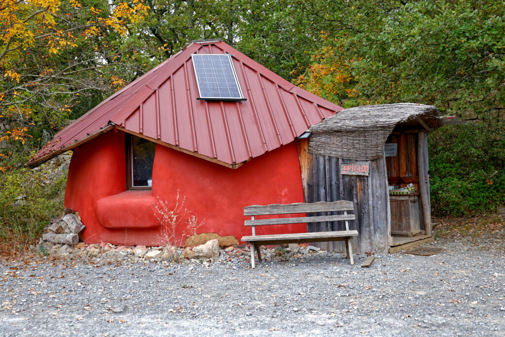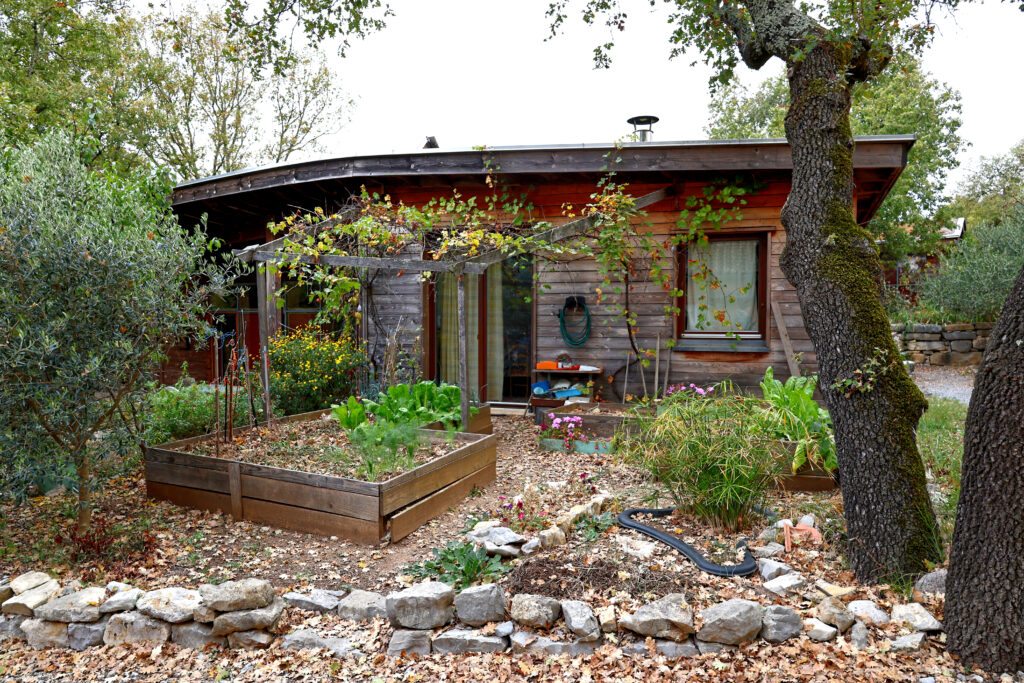 Le site s’organise autour d’un grand espace central, bordé de maisons bioclimatiques en pierre, en paille et en bois, construites selon les principes de la permaculture et de l’éco-construction.