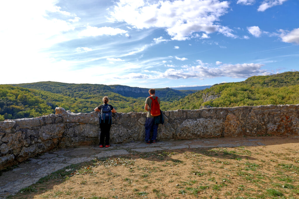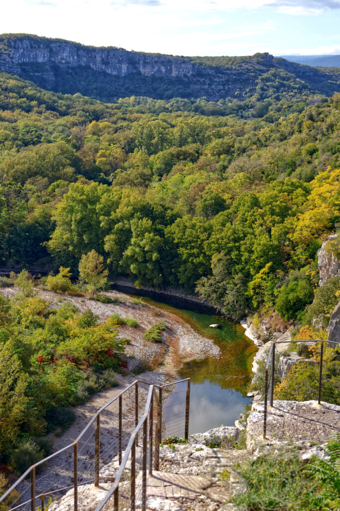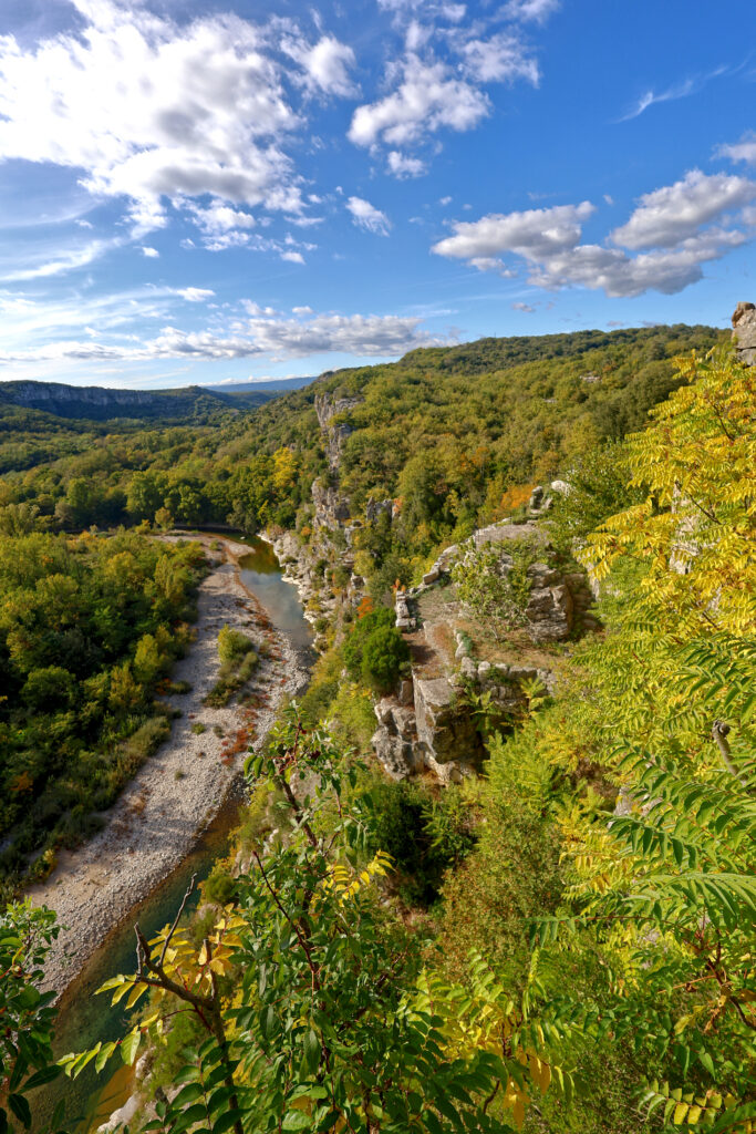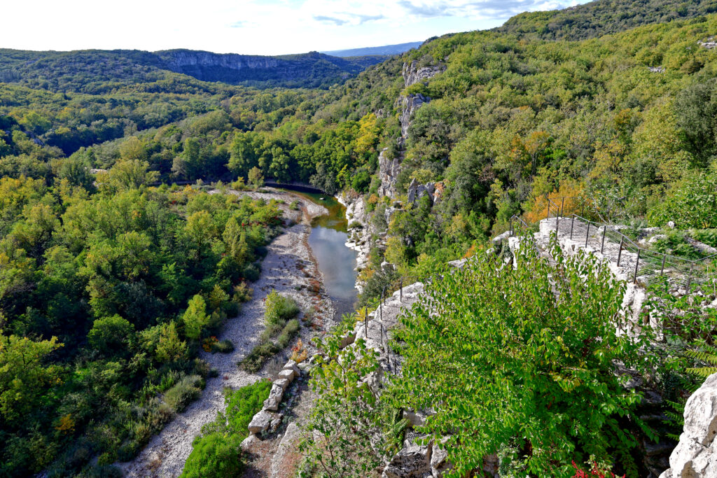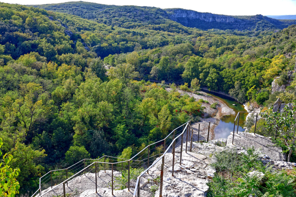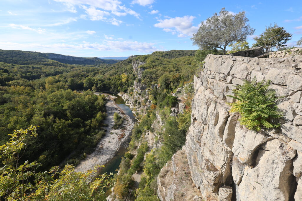 Arrivé au sommet du parcours, la récompense est à la hauteur de l’effort : une vue plongeante sur le village de Labeaume, blotti au creux de ses falaises. Les toits de tuiles, la rivière qui serpente et les hautes parois calcaires composent une scène de carte postale.